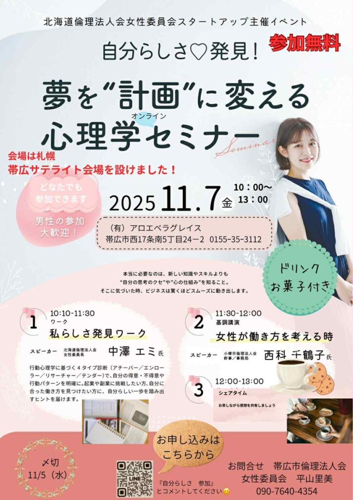 HOME > 帯広市倫理法人会 > 【女性委員会】自分らしさ♡発見!夢を”計画”に変える心理学セミナー