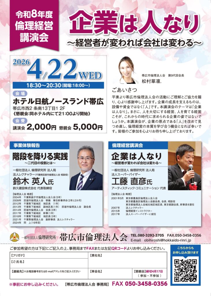 【帯広市】倫理経営講演会 企業は人なり ~経営者が変われば会社は変わる~