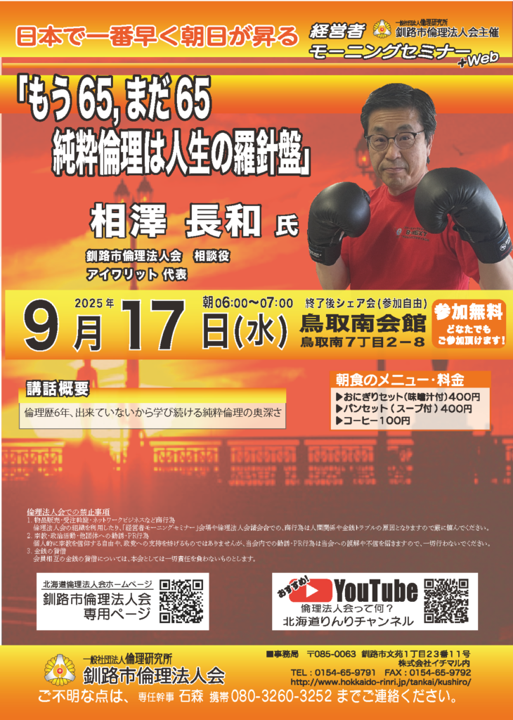 第259回 釧路市倫理法人会経営者モーニングセミナー+Web「もう65、まだ65 純粋倫理は人生の羅針盤」