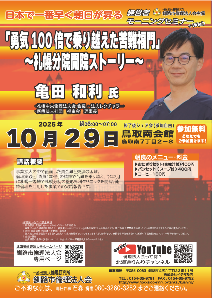 第265回 釧路市倫理法人会経営者モーニングセミナー+Web「勇気100倍で乗り越えた苦難福門~札幌分院開院ストーリー~」
