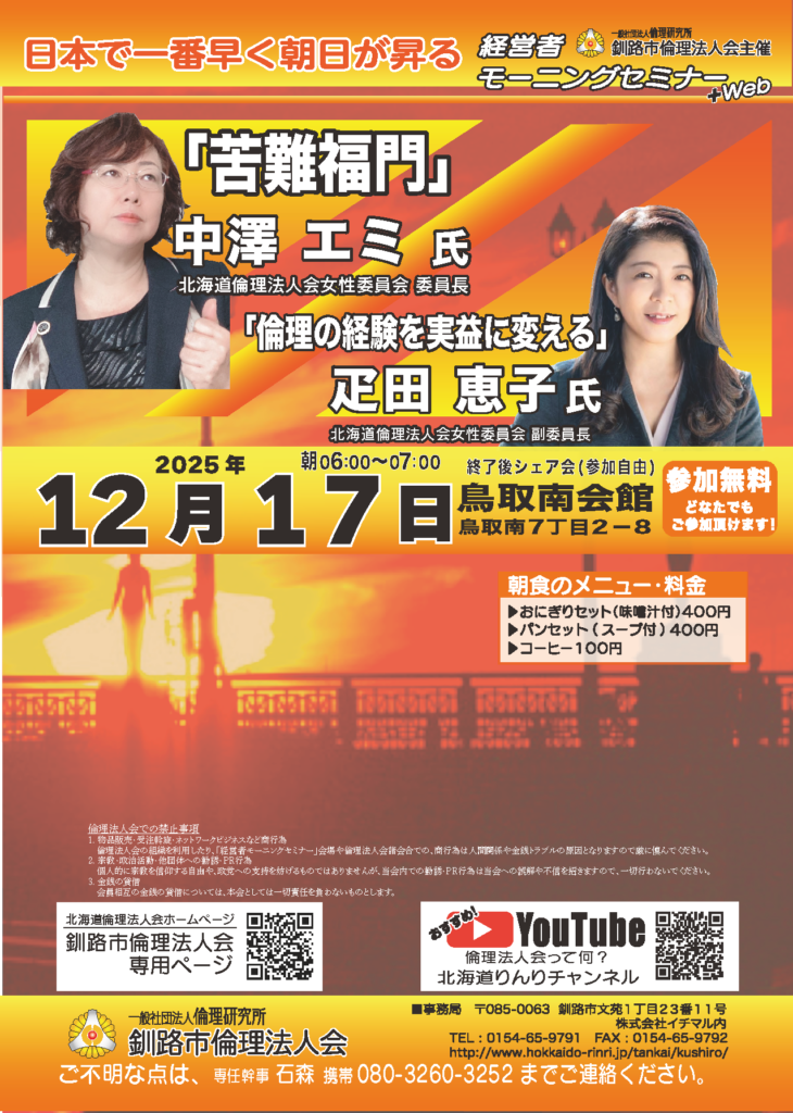 第272回 釧路市倫理法人会経営者モーニングセミナー+Web「苦難福門」・「倫理の経験を実益に変える」