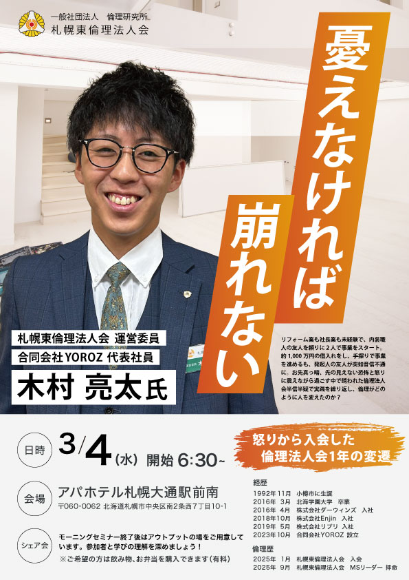 2026年3月4日 札幌東倫理法人会モーニングセミナー憂えなければ崩れない 怒りから入会した倫理法人会1年の変遷