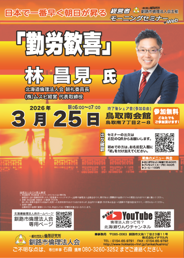 第284回 釧路市倫理法人会経営者モーニングセミナー+Web「勤労歓喜」