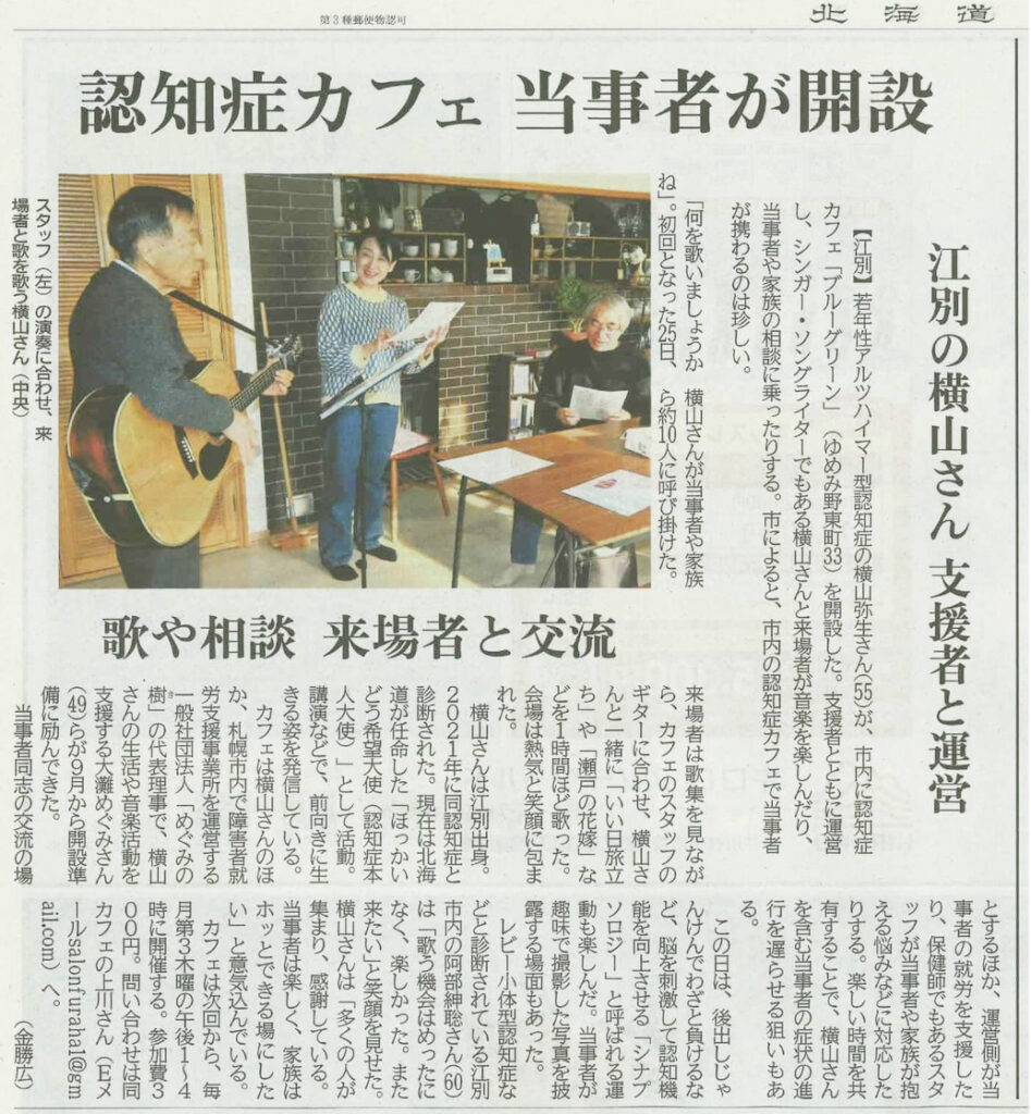 江別市倫理法人会・大灘めぐみ会長が新規開設した認知症カフェ「ブルーグリーン」が北海道新聞に掲載されました!