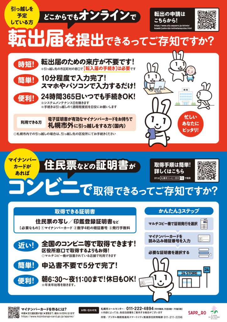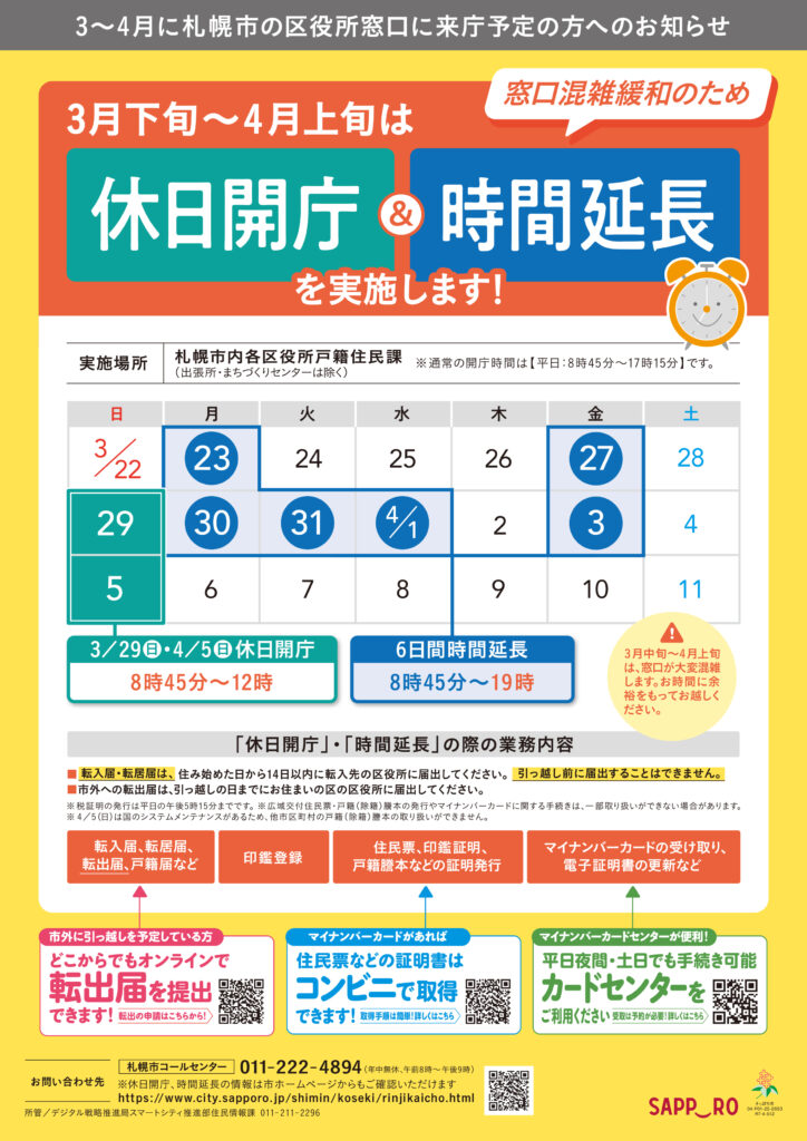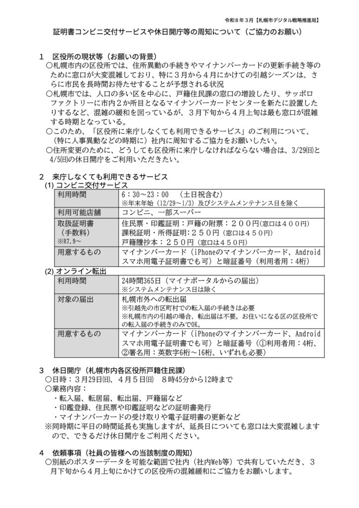 札幌市では3月・4月の転入・転出が増加する時期に伴い、転入転出届、住民票、各種証明書取得の混雑緩和対策として、休日開庁・開庁時間の延長を行っています。またマイナンバーカードを活用したコンビニエンスストアでの各種証明書取得、オンライン転出などを活用を呼びかけています。