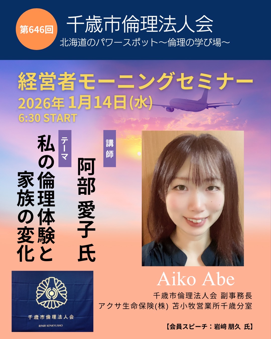 千歳市倫理法人会で、第6代目の会長を仰せつかっております阿部政友と申します。