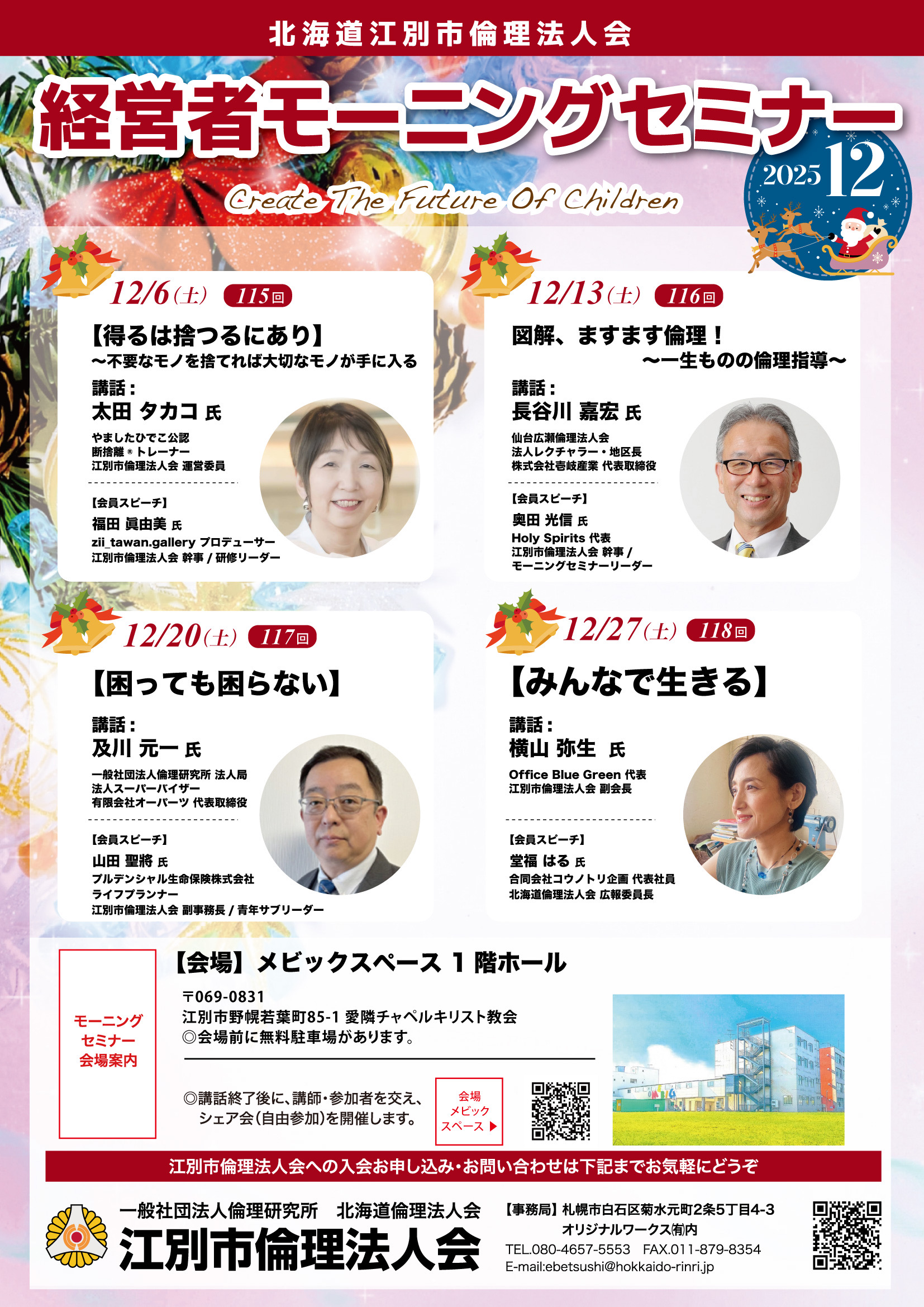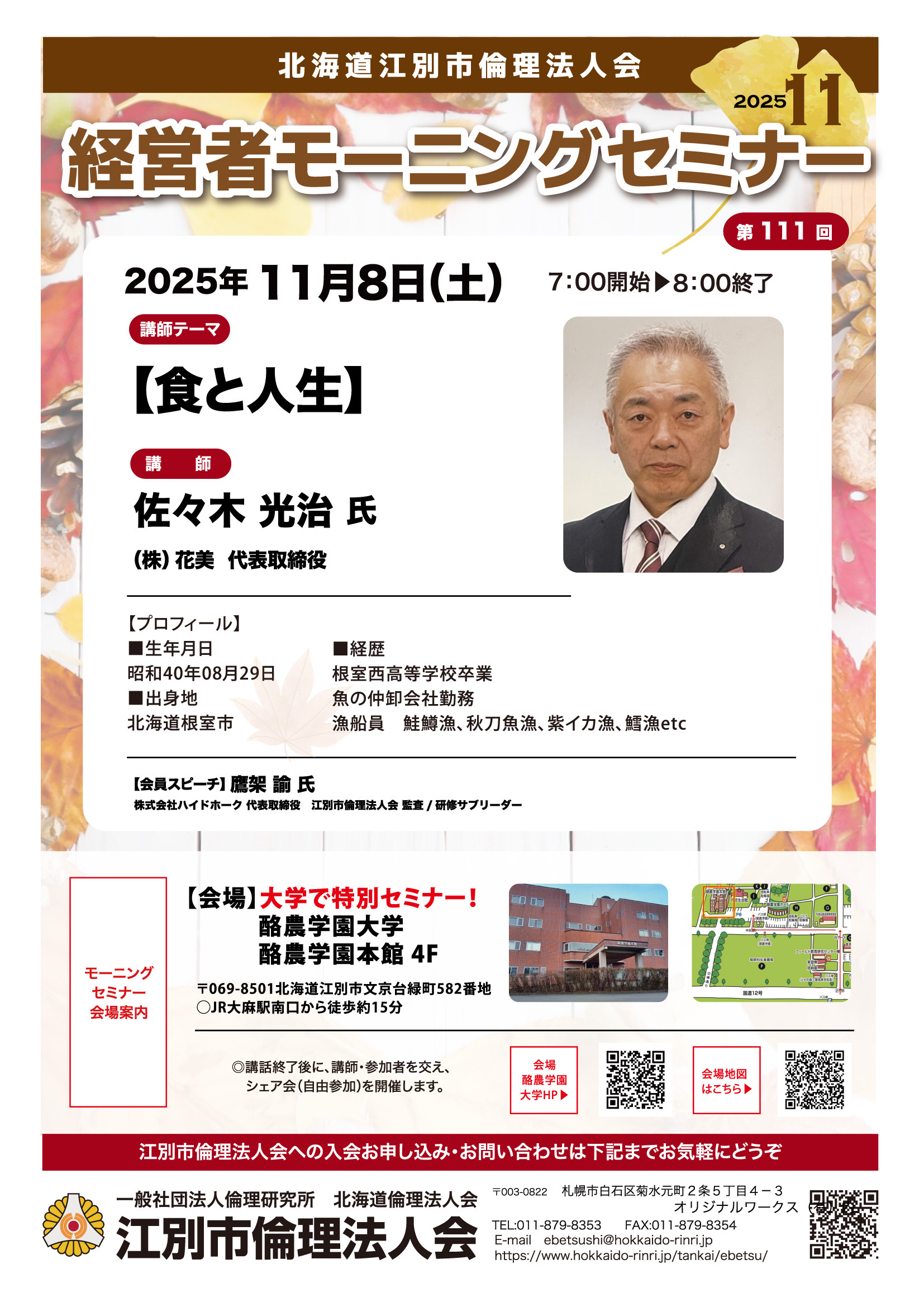 江別市の地に北海道で19番目の倫理法人会として2023年7月に誕生しました。若手の子育て中の経営者とベテラン経営者とが融合のもと「子どもたちの未来を創る」という、かけがえのないスローガンを胸に抱き、可能性が無限大に溢れた子供たちが、より未来へ大きく軽やかに羽ばたいていけるよう、「こころの在り方」の礎となる幸せの生活法則「万人幸福の栞」を通した学びと実践・体験を私たちは大切にしています。心豊かに幸せな道筋となる承継したこの学びのバトンと想いを、子から孫…大切な未来の子どもたちへと繋いでいくことを使命に、2代目会長としてこの江別の地から、希望となる心の太陽の光を優しくあたたかく放ってまいります。みなさまとともに、世代に渡って未来を創造し、繋いでいけることを心より楽しみにしております。
