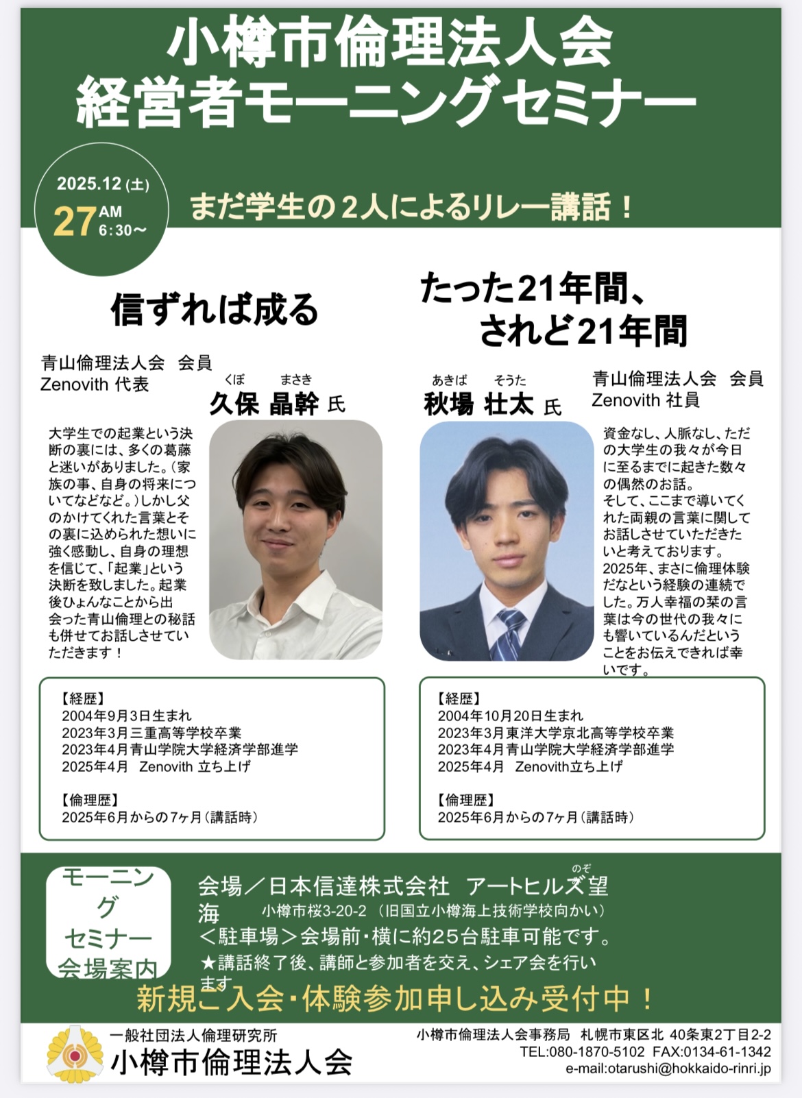 まさに先人が歩んだ魂の生き方を受け継ぎ、倫理の学びを通して新たな小樽を築いていく。倫理法人会の2大スローガン、『日本創生』、『地球倫理の推進』この思いを肚に落としこみ、明朗(明るく)愛和(楽しく)喜働(喜んで働く)で人間力向上を目指して、活動して参ります。