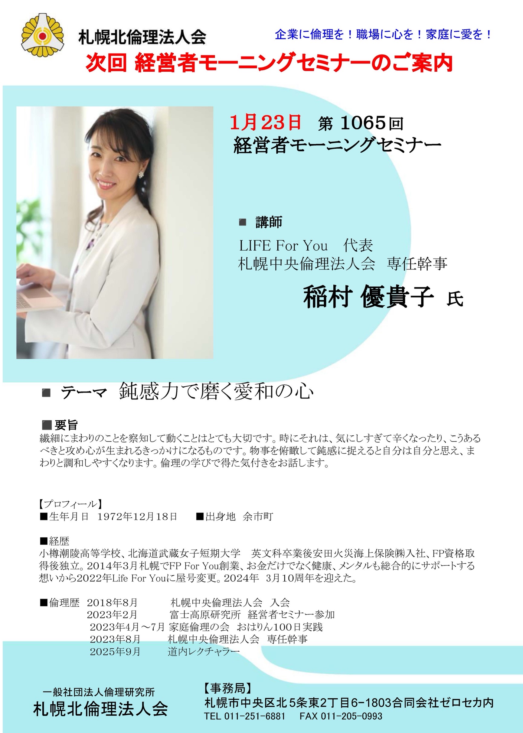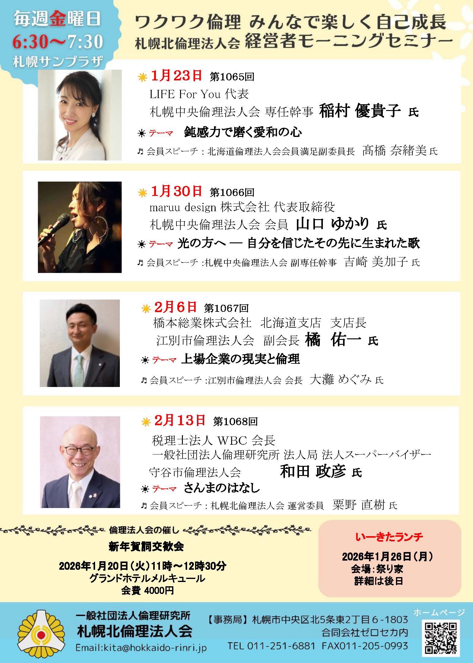 札幌北倫理法人会の大きな特徴は、「ベテランと若手が融合したアットホームな雰囲気」です。この持ち味を活かし、誰もが安心して学び、実践できる環境を守り続けていく所存です。
